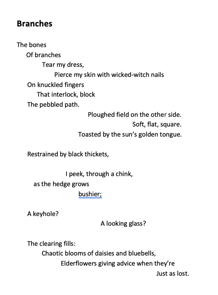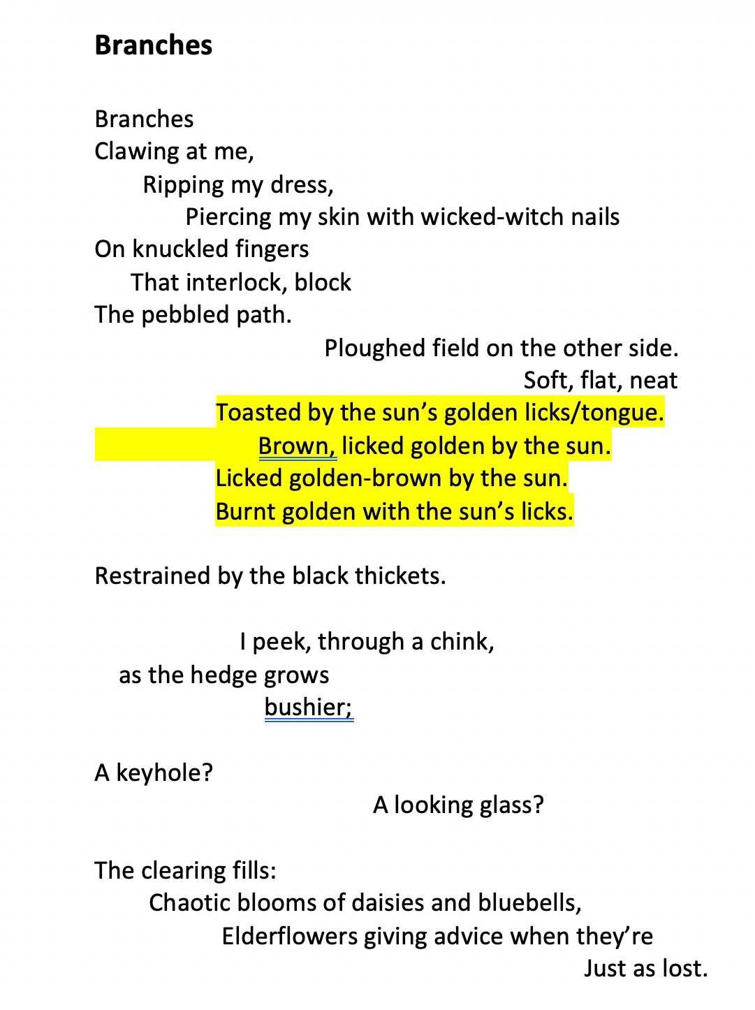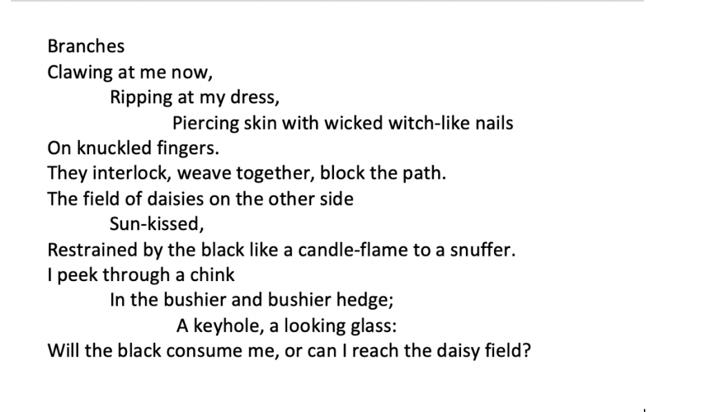 When editing the first draft I thought it was important to remove/edit the clichéd lines such as ‘sun-kissed’ , ‘field of daisies’, or the image of the candle and snuffer. I also wanted to use the layout to enact the content more, which I achieved by moving the ‘field’ to the other side of the page. I also made the gaps between lines etc. mirror a partially blocked path or a bush with small gaps that you can peek through. I further added to the end of the poem as it didn’t feel finished.