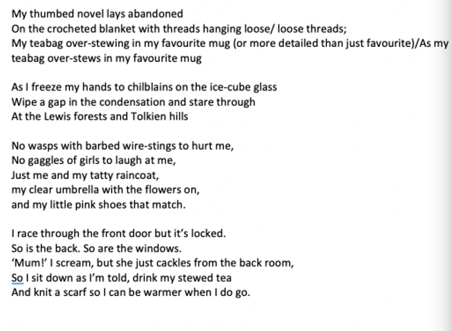 This poem has gone through several different titles, but I have decided to call it Longing for Outside as I think it captures the essence of the poem of longing to go outside. I am still deciding whether or not to use this title for the sequence I have made with this poem, Novel, and Blanket, and instead call this poem a different title within that sequence.