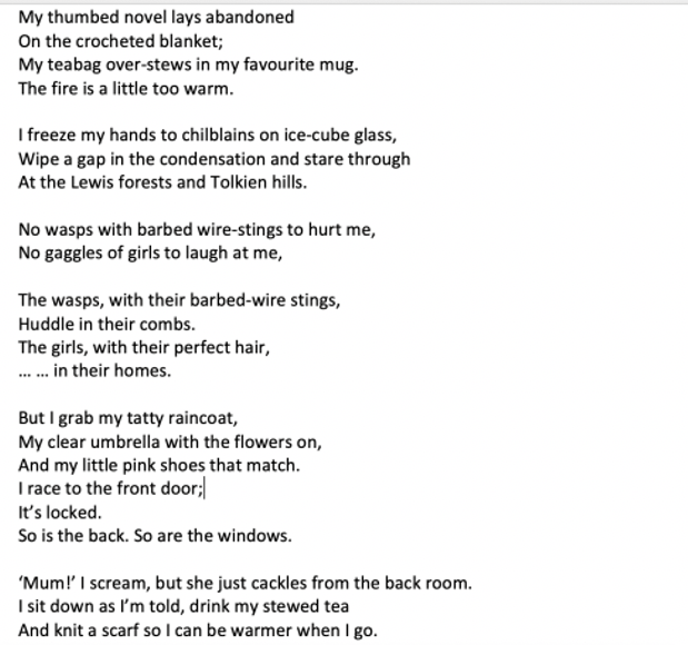 - There are only small changes between the 5th draft and the final draft of this poem, it was more just refining it and removing a couple of lines and words that I felt were unnecessary. The poem has elements of inspiration from the summer lockdown and isolation, alongside the internal dilemma of choosing to go outside fo your comfort zone. It also alludes to the Odyssey (the ropes and the wax allude to when Odysseus asks his men to tie him down as they pass the sirens and the wax he puts in their ears so they don’t hear it and go overboard), Narnia, and The Lord of the Rings, which are some of my favourite texts about adventures, but which also all have strong senses of loyalty to home and wanting to return home, and so fit nicely with the theme of the poem.