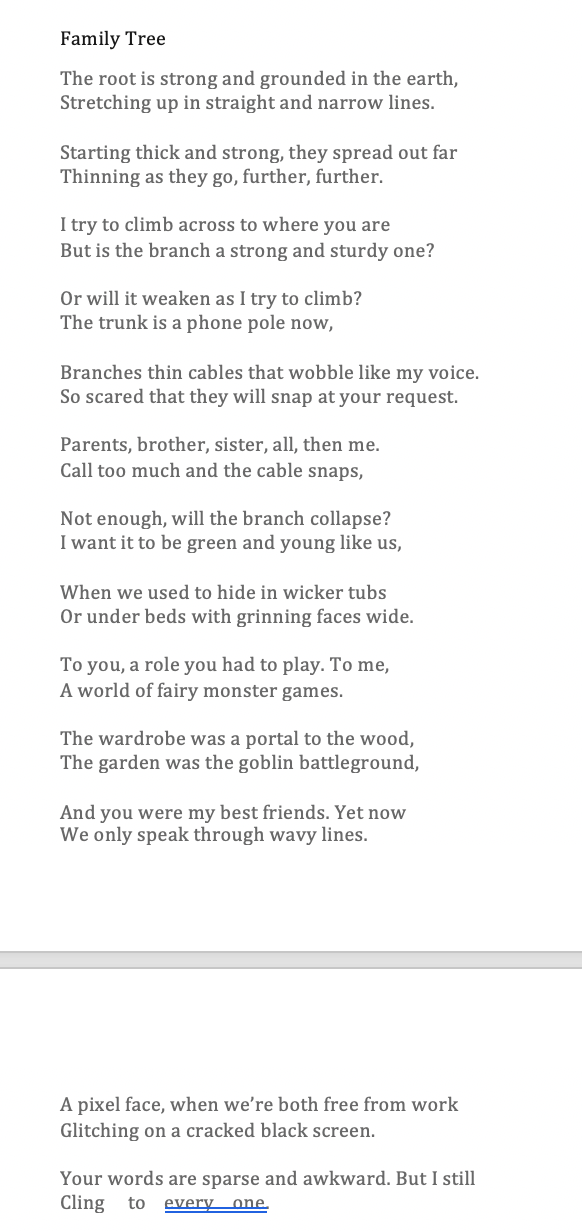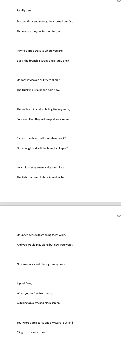- In the final lines of this draft I consciously diverted from the iambic pentameter because I wanted to mirror the ‘glitching’ of the conversation. I also cut out lines that I wasn’t keen on from the previous draft and made the metre strict across the rest of the poem, to make it more emphatic when I break it at the end.