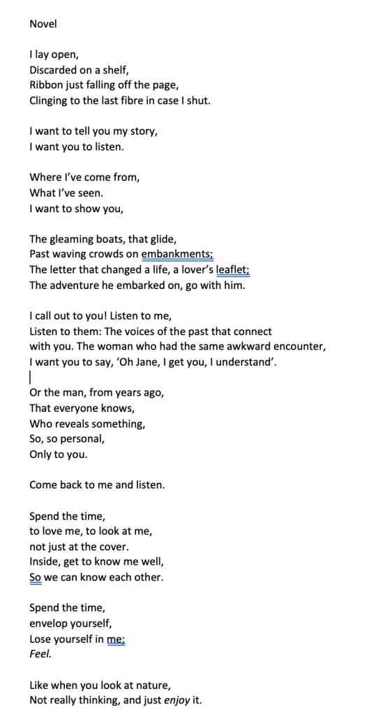 - This poem originated from a seminar exercise in which we had to write from the voice of an object from one of our existing poems. I decided to write from the perspective of the novel mentioned in Longing for Outside.