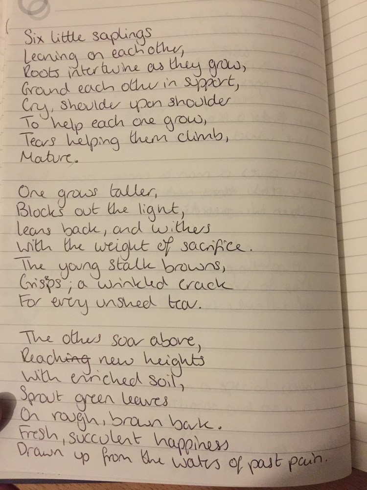 - The idea behind this poem is a group of young friends supporting each other. It contains themes of mental health, friendship and learning presented through the metaphor of saplings growing into trees.